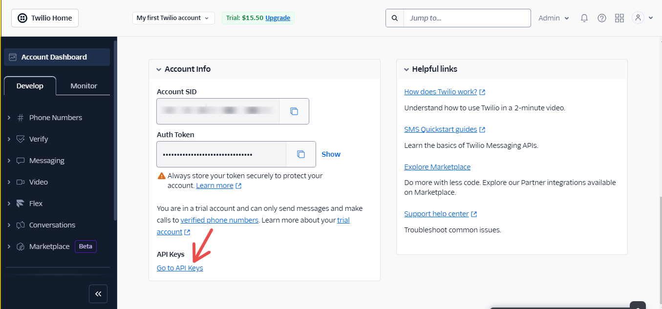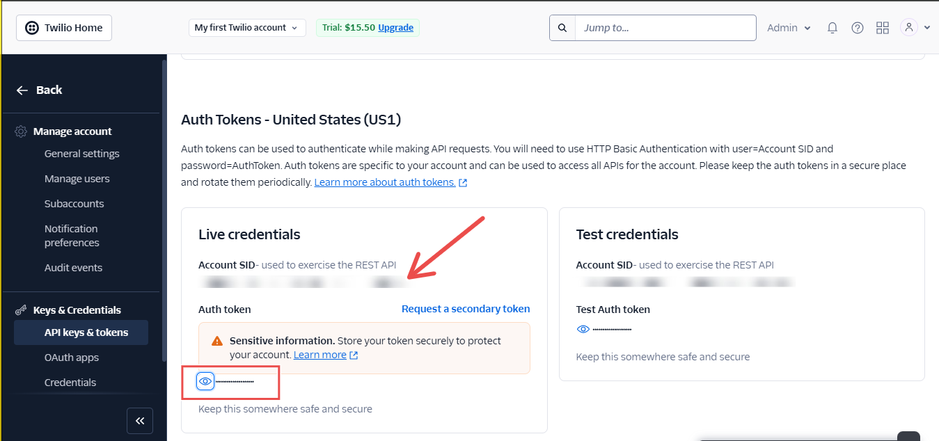 - Click on API Keys and Tokens, in the live credential section you will see your Account SID and your Auth Token, which you will use to access the APIs.